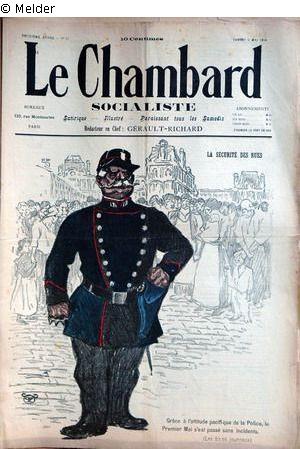 "Im Hintergrund eine dicht gedrängte Menschenmenge in der Großstadt Paris. Im Vordergrund ein bewaffneter Polizist mit gekräuseltem Schnurrbart. In seiner linken Hand umklammert er einen Schlagring und die rechte ruht griffbereit am Pistolenhalfter. Ein Gegensatz zum Bericht einer Zeitung: ‚Dank der friedfertigen Haltung der Polizei, verstrich der 1. Mai ohne Vorkommnisse‘. Doch dem Betrachter wird klar, wenn sich die Masse in Bewegung setzt, kann sie die Staatsmacht nicht mehr stoppen. In dem Aufsatz „Dans la Rue“ (1905) schreibt der Autor Erich Klossowski über Steinlen: ‚Und er malt das Volk als Menge, zum Bewusstsein seiner Kräfte erwacht, im Streik, im Aufruhr, von einer Leidenschaft hingerissen, unaufhaltsam vorwärtsdrängend, malt jenes Massenantlitz der Menge, das sich aus hundert Masken zusammensetzt, wie es vor ihm nur Daumier gesehen hat‘. " (UW)