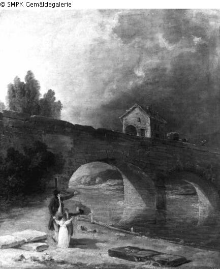 Tafelmalerei: Bild: Landschaft mit einer Brücke, einem Viadukt oder Aquädukt; Brücke; Viadukt; Aquädukt; Bez. rechts unten am Stein: H Robert . 1804; Signatur: H Robert. 1804; Maße: 55 x 46 cm