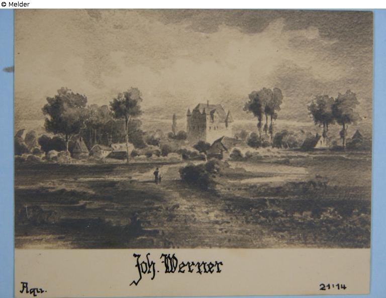 Landschaft mit Häusern, Bäumen und Schloss