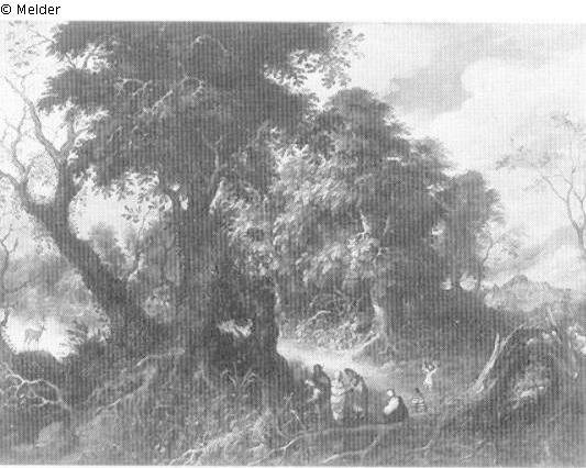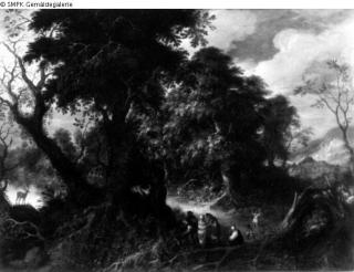 Tafelmalerei: Bild: Laubwald & umherziehende Gemeinschaften: Zigeuner & Huftiere: Hirsch; Wald; Laubwald & Zigeuner & Hirsch