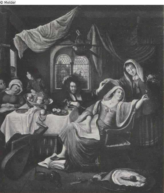 Eine Frau sitzt rechts vor einem Tisch, der mit Früchten beladen ist. Sie lässt ihr Glas von der hinter ihr stehenden Magd füllen, deren Hand ein Mann, der ebenfalls am Tisch sitzt, hält. Links kitzelt ein junger Mann mit einem Strohhalm die Nase einer schlafenden Frau, während ein anderer einen Bettler verscheucht, der seinen Kopf durch das Fenster steckt. Auf dem Boden liegen eine Mandoline, ein Schinken, den die Katze schnüffelt, und eine zerbrochene Flasche.