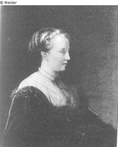 lebensgroß, fast Halbfigur, beinahe vollständige Seitenansicht von rechts; das Haar am Hinterkopf von Ketten (?) zusammengehalten, kleine Ohranhänger; dunkles Gewand in Schulterhöhe über einer hellen, am Hals geschlossenen Bluse; ein Replik im Wörlitzer Schloß; Signatur: A. Pesne; Maße: 77 x 65,8 cm