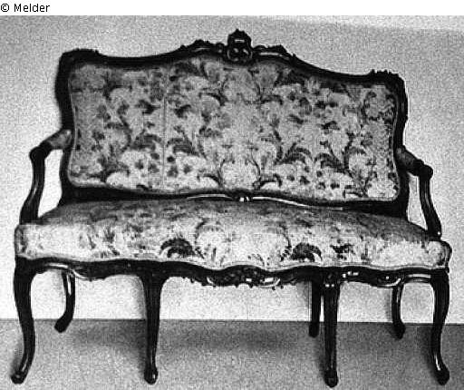 Lehnbank Louis XV, gepolstert. Naturfarbenes Nußholzgestell, elegant geschweift auf acht geschwungenen Beinen. Geschnitzt mit Kehlen, Stäben und Blütenwerk. Gold und broschierte hellblaue Ripsseide als Bezug. Frankreich