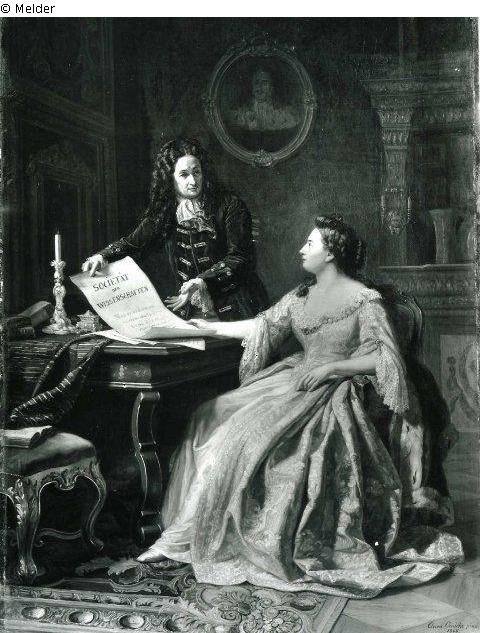 Leibnitz legt Königin Sophie Charlotte seinen Plan zur Gründung der Akademie der Wissenschaften vor