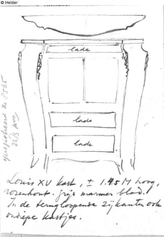 Quelle: Algemeen Politieblad van het Koninkrijk der Nederlanden, Jg. 95, Nr. 34, 30. November 1946 publizierten Liste 719 „Te ‘s-Gravenhage ontvreemd in 1943/1944, hollandsche teekeningen, t. w.“; Intern Aangifte Formulier vom 25.3.1946, BArch Koblenz B 323/2 fol. 161 mit eigenhändiger Skizze von F. Lugt;