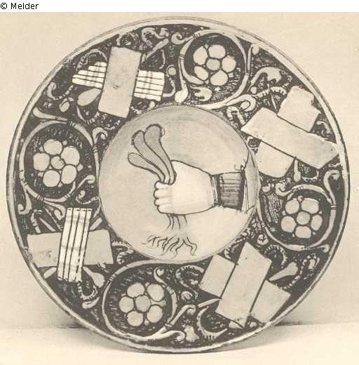A CHOICE GUBBIO RUBY LUSTRE TONDINO, by Maestro Giorgio, superbly decorated in the gold lustred sunk centre with a hand (Jupiter) in pale blue and ruby holding thunderbolts in rich ruby lustre, the everted blue rim with trofei and scrolling flowers in white, gold and ruby lustre, the underside with concentric circles and a pseudo kufic inscribed border, circa 1525
