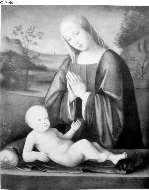 Hinter einer grauen Steinbrüstung steht die Mutter Gottes in rotem Gewand und grünem Mantel, einen durchsichtigen weißen Schleier auf dem Blondhaar, mit gefalteten Händen das Kind anbetend, das über rotem Samttuch und weißem Kissen vor ihr liegt. Als Hintergrund Landschaft mit Bergzügen und zarten Bäumen unter am Horizont aufgehelltem Himmel; Schriftliches Gutachten von L.Venturi.; Literatur: Abbildung Versteigerungskatalog Tafel 7