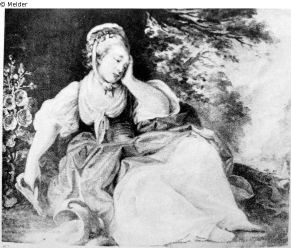 In romantischer Landschaft zu Füßen eines großen Baumes ruhend, ein junges Mädchen in weißem faltigen Gewand mit fraisefarbigem Überkleid. Das bekümmerte Gesicht ruht in der aufgestützten linken Hand, der rechte Arm - in schmerzlicher Gebärde der Machtlosigkeit herabhängend - hält einen Griff des Kruges, der zerbrochen am Boden liegt. Links eine blühende Malve. Gutachten des Charles Förster vom 14.9.1935, der die Echtheit bestätigt.