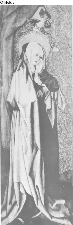 Altarflügel, Maria, die weinend die Wange gegen die linke Hand lehnt