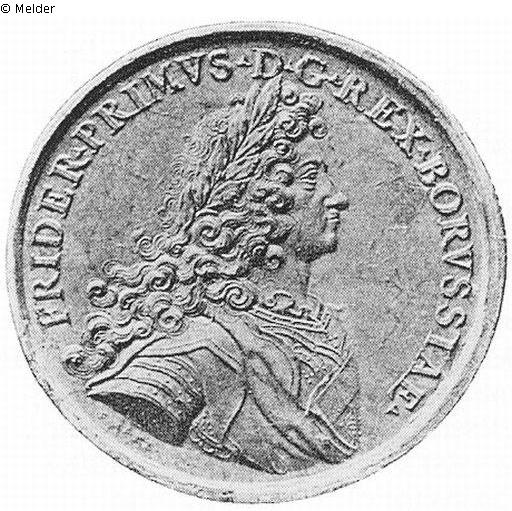 Vs.: Brustbild Friedrich I. als Stifter der Akademie; Umschrift: FRIDER · PRIMVS · D · G · REX · BORVSSIAE · (Signatur) F · MARL
