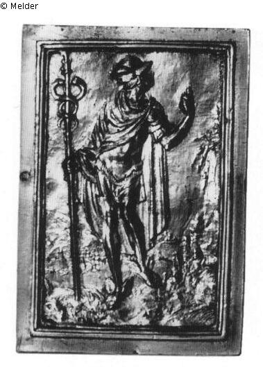 Rechteckige Plakette, profilierter Rahmen. Merkur mit Panzer und Mantel, Flügelhut und -schuhen schwebt über einer Landschaft mit einer Stadt und Felshängen im Hintergrund. Er erhebt den linken Arm, und in der rechten Hand hält er den Schlangenstab. Die Plakette stammt aus der Folge der sieben Planetengötter, zu der auch die nachfolgenden Stücke gehören.