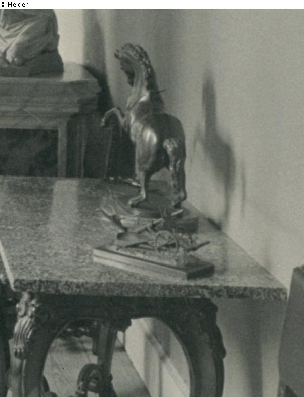 Das Modell vor dem „Sich aufbäumenden Pferd“ von Adriaen de Vries auf einem Tisch im Wandelgang Gartenflügel 2. Etage, Schloss Wolfsburg, Photo aus Hausarchiv der Grafen von der Schulenburg-Wolfsburg, 826 (Fotoalbum „Wolfsburg 1924“), Ausschnitt