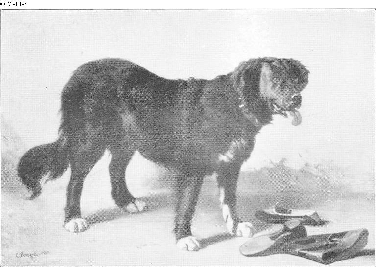 Schwarzer Hund, stehend, heraushängende Zunge, zwei verschiedene Schuhe liegen vor ihm, mit denen er gespielt hat; Rahmen: Außenmaße: 148 x 102 cm