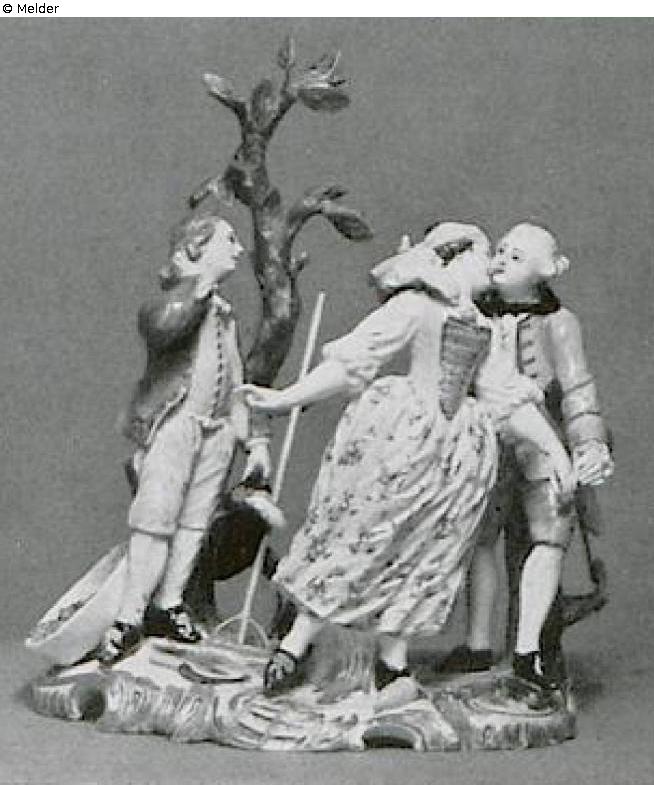 „Le baiser donne.“ Der Gutsherr küßt die junge Frau seines Pächters, der daneben steht und sich am Ohr kratzt. Der Gutsherr in goldbesetztem, hellpurpurnem Anzug. Die Frau in gelbem Mieder mit eisenrotem Stecker und bunt geblümtem, weißem Rock. Der Pächter in hellblauer Jacke, hellbrauner Weste und hellgelben Kniehosen. Neben dem Pächter ein belaubter Baumstamm und ein Korb mit Heu. Den Sockel umziehen purpur- und goldgehöhte, reliefierte Rocaillen. Besonders schöne Ausformung. Eisenrotes Rad und C. Die Gruppe entspricht inhaltlich dem gleichnamigen Stich Filloeuls nach einem Gemälde Paters, zu dem Moraine Verse schrieb, die an eine Erzählung Lafontaines anknüpfen. Der Stich ist aber nicht das Vorbild dieser Höchster Gruppe. Auf die Höchster Gruppe geht dafür die Frankenthaler Gruppe „Der gegebene Kuß“ zurück