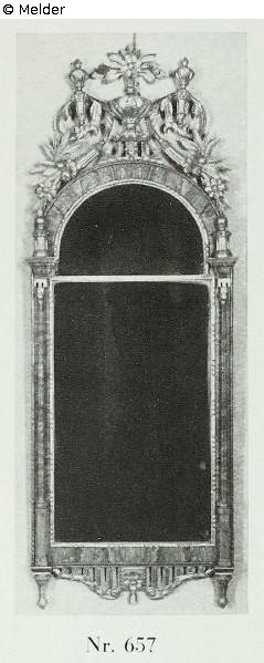 in reicherer Schnitzerei, mit buntem Marmor belegt und an den Seiten Marmorsäulen mit Kapitellen. Alte Original-Blattvergoldung. Quelle: Kunsthaus Heinrich Hahn: Sammlung V. O., Gemälde, Möbel des 18. Jahrhunderts, Metallarbeiten, aus verschiedenem Privatbesitz, Gemälde alter Meister, Gemälde und Handzeichnungen. Auktion vom 07.-08.05.1940 (Katalog Nr. 61). Frankfurt a. M. 1940. Kat. Nr. 657.