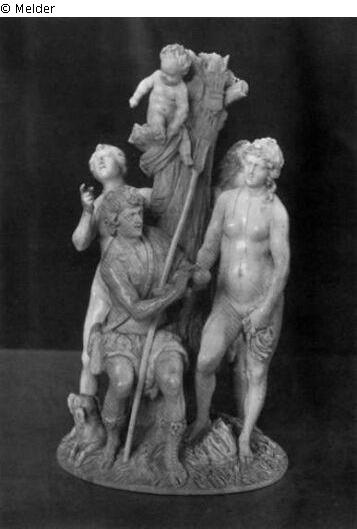 Die Figuren sind um einen hohen Baumstumpf gruppiert: Paris sitzt, hält in seiner linken Hand den Hirtenstab und reicht mit der Rechten den Apfel an Aphrodite, die links von ihm steht. Zu seinen Füßen sitzt rechts ein Hund. Amor, seinen Köcher mit Pfeilen neben sich gehängt, sitzt auf einem Ast des Baumstumpfes und schaut auf Paris herab. Rechts hinter Paris steht Hera, ihren rechten Zeigefinger drohend gegen Amor erhoben. Ihr Attribut, der Pfau, sitzt hinter ihr am Boden. Hinter Aphrodite steht Athena. Sie trägt einen Helm; über ihr sitzt die Eule auf einem Ast des Baumstumpfes. Die Gruppe steht auf einem flachen, runden Sockel, auf dem Gräser und Blüten dargestellt sind.