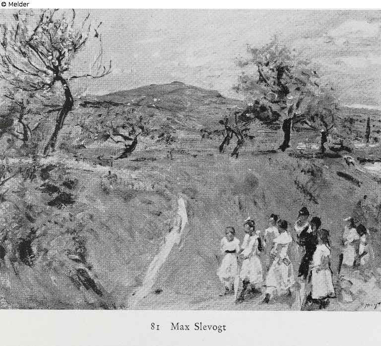 im Vordergrund auf Wiesenrand weiß gekleidete Mädchen, weiter hinten blühende Obstbäume, durch die man auf eine Bergkuppe sieht, hellblauer Himmel
