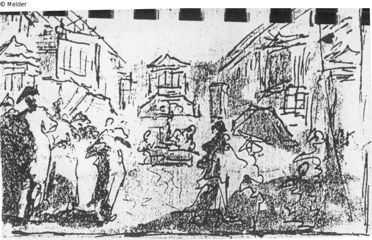 Niedriges Gebäude im rechten Winkel zum Platz. Stift und Tinte-Zeichnung in Sepia. Bei Burlet, Berlin 1927.