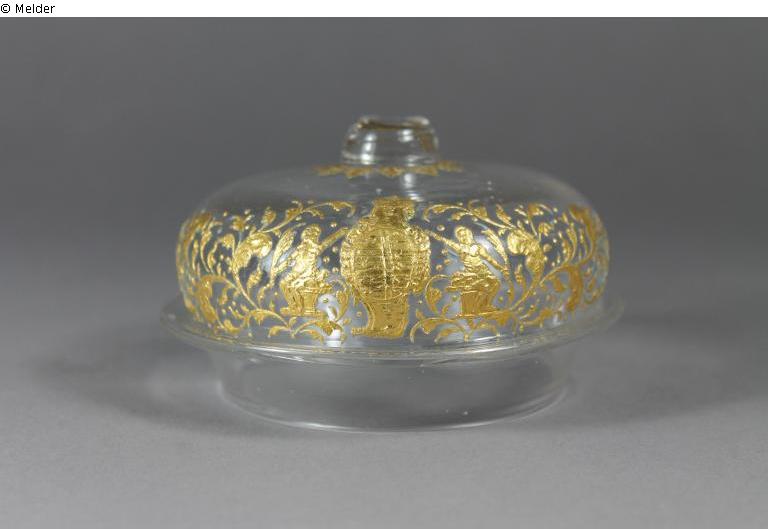 Pokal (Becher) von dickem Glas mit Deckel, innen und außen mit Blumen in dicker Vergoldung verziert, am Deckel (welcher nicht passt und den Knopf verloren hat,) das sächsische Wappen. Deckel in der Sammlung erhalten.