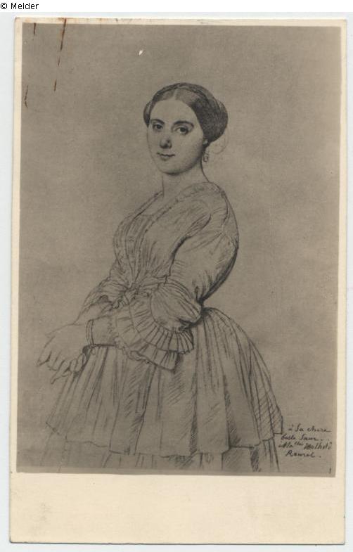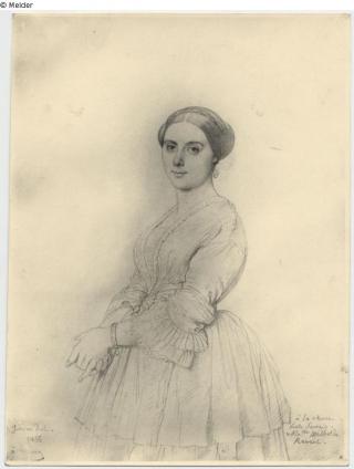 Kniestück einer nach links gewendeten stehenden Dame, das Gesicht dem Beschauer zugewandt, die Hände über dem Leib ineinander gelegt; bez. und datiert unten links: "J. Ingres Del. 1855", rechts unten Inschrift: "A sa chère belle Soeur Mlle Mathilde Ramel"; verso ein aufgeklebter Ausstellungszettel: "Exposition Ingres 1911" der Galerie Georges Petit mit der Angabe des damaligen Besitzers (Gustave Régnier)
