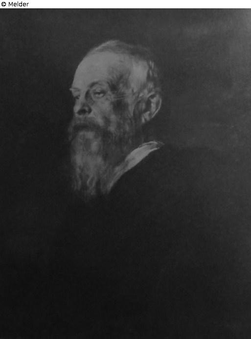 Lebensgroßes Brustbild ohne Hände - zweidrittel Profil nach links, Blick nach links vorn gerichtet - in dunklem Rock mit hellem Kragen. Licht von vorn links. Glanzlicht auf Stirn und weißem Kragen. Kräftiger Fleischton, vorherrschend Rot und Braun. Graues Haar, rötlichgrauer Vollbart, schwarzer Anzug, dunkelbrauner Hintergrund. Bezeichnet links seitlich: F. Lenbach 1902