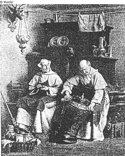 zwei Mönche in weißen Kutten beim Putzen des Kupfergeschirrs in der Klosterküche; signiert