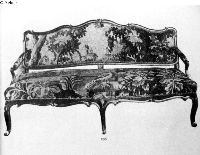 Dreisitzig, mit Verdurenbezug. Das geschweifte Gestell braun gebeizt. Gestell und Bezug 18. Jahrhundert.