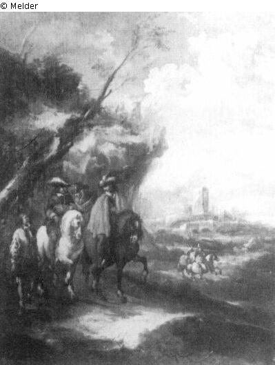 To the left on a road under a streep are three riders and a servant. Two more riders and buildings with a four-corned tower, in the distance.