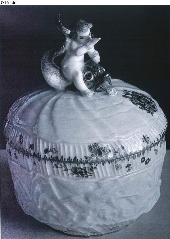Flachrelief, auf dem Sockel zwei schwimmende Schwäne zwischen Binsen, auf der Rückseite ein Kranich im Flug und ein weiterer, der einen Fisch frisst, auf spiralförmigem Muschelgrund, der Deckel mit ähnlichem Muscheldekor, darüber ein Putto, der auf einem Delphin reitet, der Rand bemalt mit den Wappen von Brühl und Kolowrat-Krakowska und verstreuten Blumenzweigen, vergoldete Randeinfassung, gekreuzte Schwertermarke in Unterglasurblau.