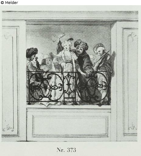 Im Hintergrund Zuhörer. Aquarellentwurf für ein Wandbild, mit Rokokoarchitekturangabe.