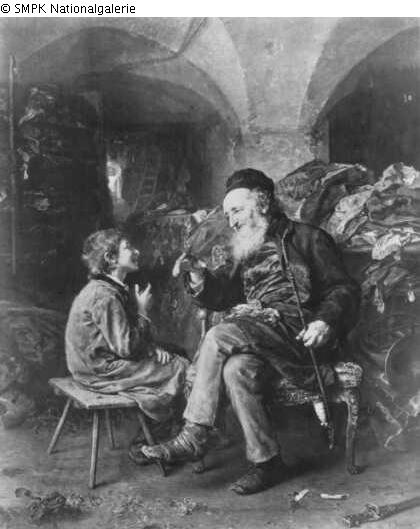 Tafelmalerei: Bild: männliche Händler, Gewerbetreibende, Kaufleute & alter Mann : weiser Mann & die Juden, jüdisches Leben & Junge (Kind zwischen Kleinkindalter und Jugend) & auf einer Erhebung sitzen & Lagerraum