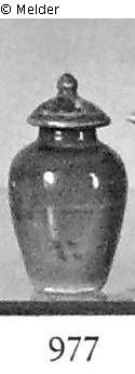 a,b,c) Drei Vasen: zwei Deckelvasen, eine Flöte. Bleu poudré (mit Gold). d,e) Zwei Miniatur-Doppelkürbis-Väschen, braun-schwarz glasiert. Nr. 159: Reste von Goldstaffierung. (Helbing: a,b,c) Zwei Deckelväschen und eine Flöte. Mazarinblau mit Goldmalerei. d,e) Schlanke Flaschenkürbisform. Mirrorblackglasur.)