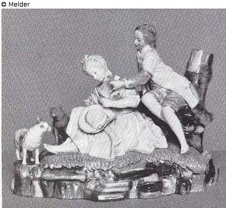 Melchior-Modell, das Mädchen flicht sich Blumen in den Hut, die ihr von einem jungen neben ihr sitzenden Schäfer gereicht werden, vor ihr Hund und Schaf, farbig dekoriert, große Gruppe.
