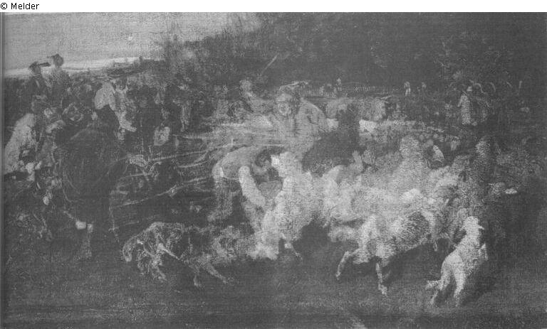 - eine Herde von Schafen ist in Unruhe gekommen und wird von den Hirten wieder zur Ruhe gebracht; Händler feilschen miteinander,