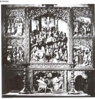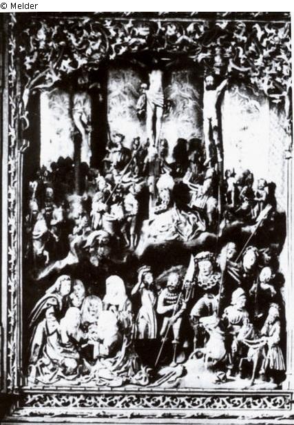 Vielfigurige Kreuzigungs-Szene, mehrschichtiger Reliefaufbau mit zahlreichen Nebenszenen in der Art der Volkreichen Kalvarienberge; die Einzeldarstellungen durch Erdschollen, bzw. Felsen in zwei Register geschieden. Die Schergen mit prägnant modischen Erscheinungsbild. Auffallende Unterschiede in den Proportionen der Figurengruppen