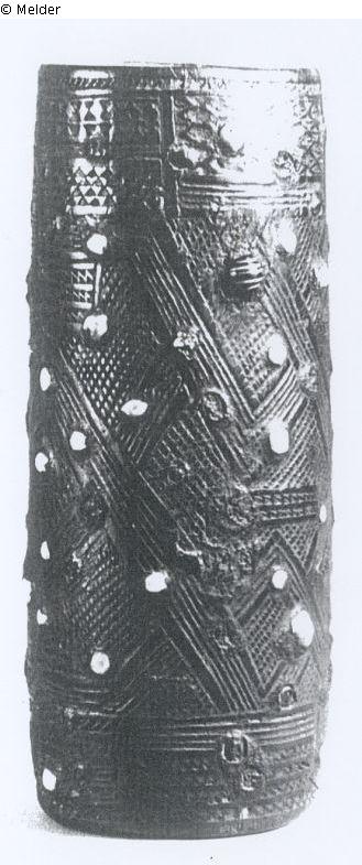 Schwarzer Köcher mit weißen Steineinlagen auf reliefiertem Muster