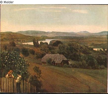 (Schwarzwaldlandschaft) - Von den in dunstiger Ferne liegenden hohen Schweizer Bergen herkommend, fließt der Rhein, silbrig leuchtend in großem Bogen durch das grüne Tal. Im Mittelgrund ein Bauernhaus neben Laubbäumen, die den Fluss überschneiden. Die Wiese im Vordergrund steigt stufenartig nach links an bis zu einem Holzstaket vor blühendem Holunderstrauch, an dem ein Mädchen mit rotem Kopftuch sich mit einem Bauernbub in Hemdsärmeln unterhält. Abendwolken und blauer Himmel mit langen weißen Wolkenstreifen. Bez.r.u. mit Monogramm des Künstlers und der Jahreszahl 1880. Rentoiliert. Klassiker der Kunst S. 65