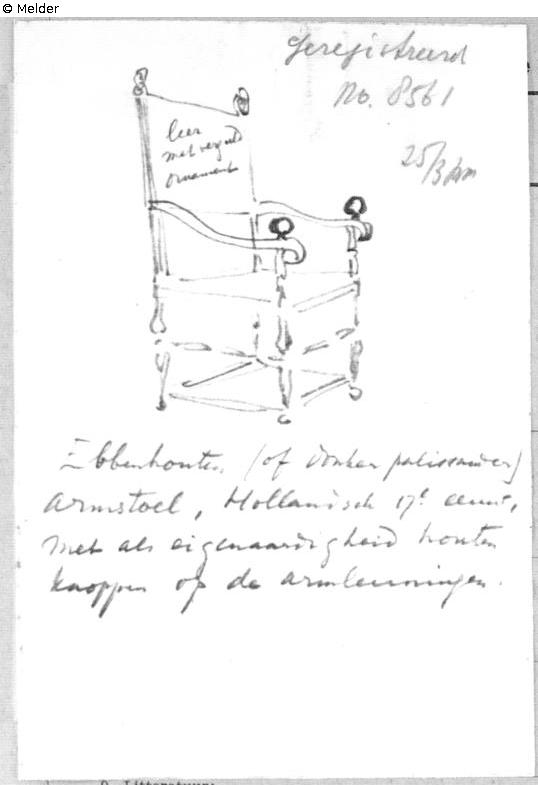 Quelle: Algemeen Politieblad van het Koninkrijk der Nederlanden, Jg. 95, Nr. 34, 30. November 1946 publizierten Liste 719 „Te ‘s-Gravenhage ontvreemd in 1943/1944, hollandsche teekeningen, t. w.“; Intern Aangifte Formulier vom 25.3.1946, BArch Koblenz B 323/2 fol. 157 mit eigenhändiger Skizze von F. Lugt;