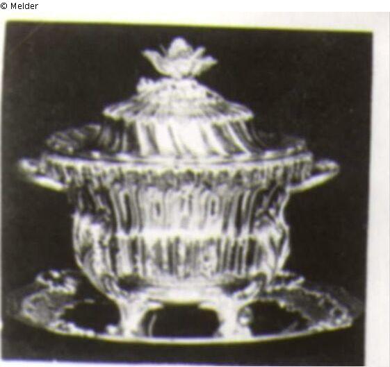 Silberne Rokoko-Suppenterrine mit Deckel und Silbertablett, den Deckel krönt ein silberner Kohlkopf