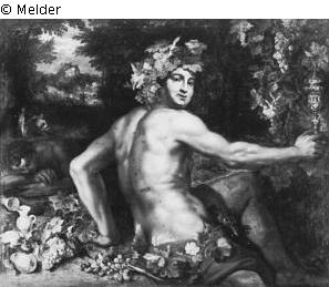 Männliche Figur einen Pokal haltend, Weintrauben und Ranken, Landschaft