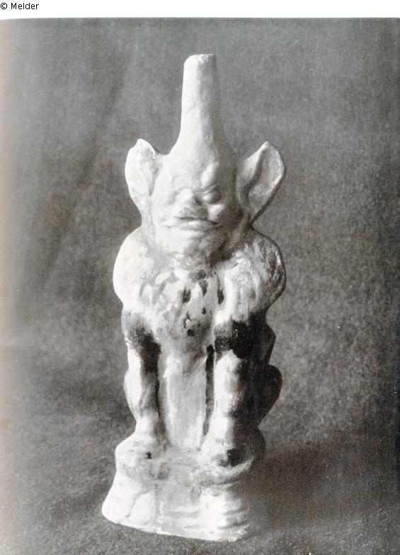 Fuchs-Text zu Tafel 14: „Grabwächter. Auf Sockel hockendes Fabelwesen mit menschenähnlichem Antlitz, Schweinsohren und Horn; Horn unvollständig; Flügelansätze an den Vorderbeinen. Gelblichweißer Tonscherben. Mit Ausnahme des Kopfes glasiert. Braun, grün und gelblichweiße Farbspuren. Höhe 33,5 cm.“ Gekittet.