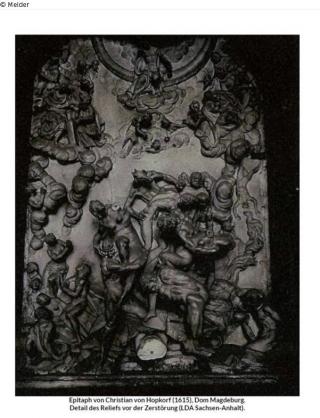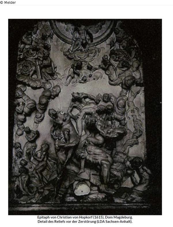 Epitaph von Christian von Hopkorf (1615), Dom Magdeburg. Detail des Reliefs vor der Zerstörung (LDA Sachsen-Anhalt).
