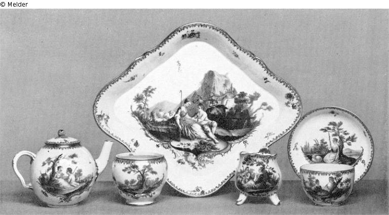 Katalog Hans W. Lange / Auktion 18.-19.11.1938, Kapitel "Porzellan. Frankenthal", S. 88: "656. Solitär: Kugeliges Teekännchen, Sahnekännchen, eiförmige Zuckerdose (ohne Deckel), Henkeltasse auf Untertasse, rhombenförmiges Tablett mit steiler Fahne. Farbig bemalt mit Hirtenszenen in Landschaftsinseln über Goldrocaillen, an den Rändern Goldspitze und Streublumen. Blaue CT-Marke. Frankenthal, um 1765. Durchm. des Tabletts 24,5 cm. Tafel 43."