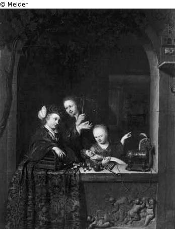 Signiert und datiert: „W. van Mieris F. 1726“; Spielende Kinder in einem weinumrankten Bogenfenster, von dem ein schöner orientalischer Teppich über einem Relief mit spielenden Amoretten herabhängt. Ein Knabe in rotem Mantel und Barett lehnt sich auf einen Vogelbauer und macht Seifenblasen. Hinter ihm steht ein anderer mit einem Vogel. Ein kleines Mädchen zeigt ihrer Puppe einen Stieglitz, der an der Seite rechts vor seinem hausähnlichen Bauer sitzt. Auf der Fensterbank stehen ein hölzernes Pferd und anderes Spielzeug.
