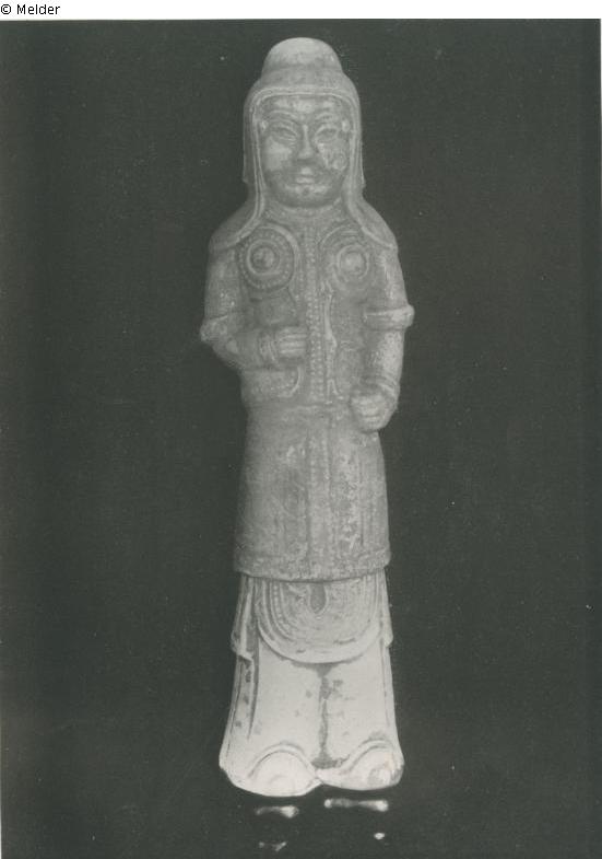 Sammlung Eduard Fuchs erworben zwischen 1912-1922 und in dessen Besitz dort bis 1933; 25.10.1933 Beschlagnahmung durch die Gestapo; zwangsweiser Verkauf (Zahlung Reichsfluchtsteuer) durch seine Tochter Gertraud Fuchs: Versteigerung Auktionshaus Rudolph Lepke Berlin, Katalog 2115, S. 14 - am 15.10 und am 16.10.1937 wurde diese Skulptur unter Nr. 157 versteigert: „TONFIGUR: Stehende Frau mit Kopftuch: weißlichgelb glasiert. Höhe 42 cm. Tang“. Laut annotiertem Lepke-Katalog (Kunsthistorische Bibliothek, Den Haag) von China-Bohlken, Potsdamer Straße 126, Berlin-Mitte) ersteigert für 31,- RM (Schätzpreis: 50,- RM). Die Protokollabschrift der Versteigerung 2115 bei der Reichskammer für Bildende Künste vermerkt maschinenschriftlich „Bohlken“ und bestätigt den Preis von 31,- RM (Landesarchiv Berlin, A Rep. 243-04 Reichskammer für bildende Künste – Landesleitung Berlin); Verbleib unbekannt