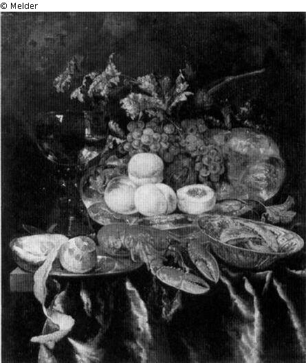 Tafelmalerei: Bild: Lebensmittel; Stilleben mit Lebensmitteln& Weinglas, Römer; Speise; Stilleben& Glas; Römer (Pokal); Signatur: Links auf der Tischplatte: ABf; Maße: 69 x 61 cm