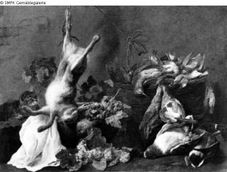 Tafelmalerei: Bild: Stilleben mit verschiedenartigen Gegenständen & Hasenjagd, Kaninchenjagd & Vogeljagd; Stilleben & Hase & Vogel