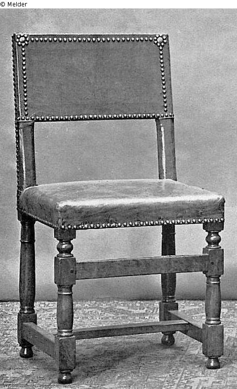 Notenhouten stoel op vier kolompoten met tussenverbindingen. Geheel met lichtbruin leder bekleed. Koperen nagels als ornament. XVIIe eeuw.