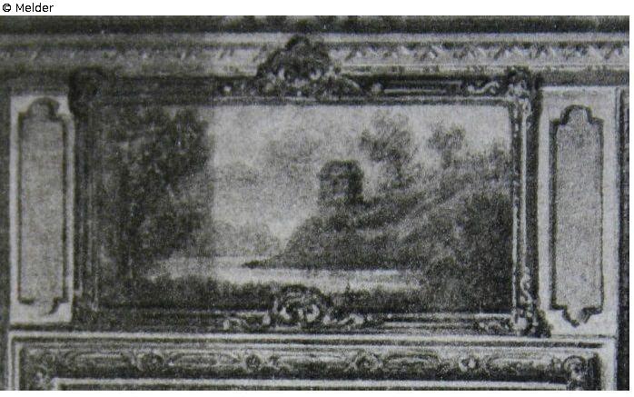 Supraportengemälde, Dargestellt: Landschaft: „Gebirgslandschaft mit Burg und Wasserfall, vorn 2 Männer u. 1 Frau mit Handkorb.“; geschnitzter polimentvergoldeter Supraportenrahmen, sog. Thielerahmen
