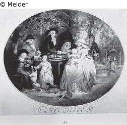 Gesellschaft mit Kindern, im Park unter großem Baum an einem gedeckten Tisch sitzend. Gestochen von F. D. Soiron, London, T. Gaugain, Qu.-Folio.